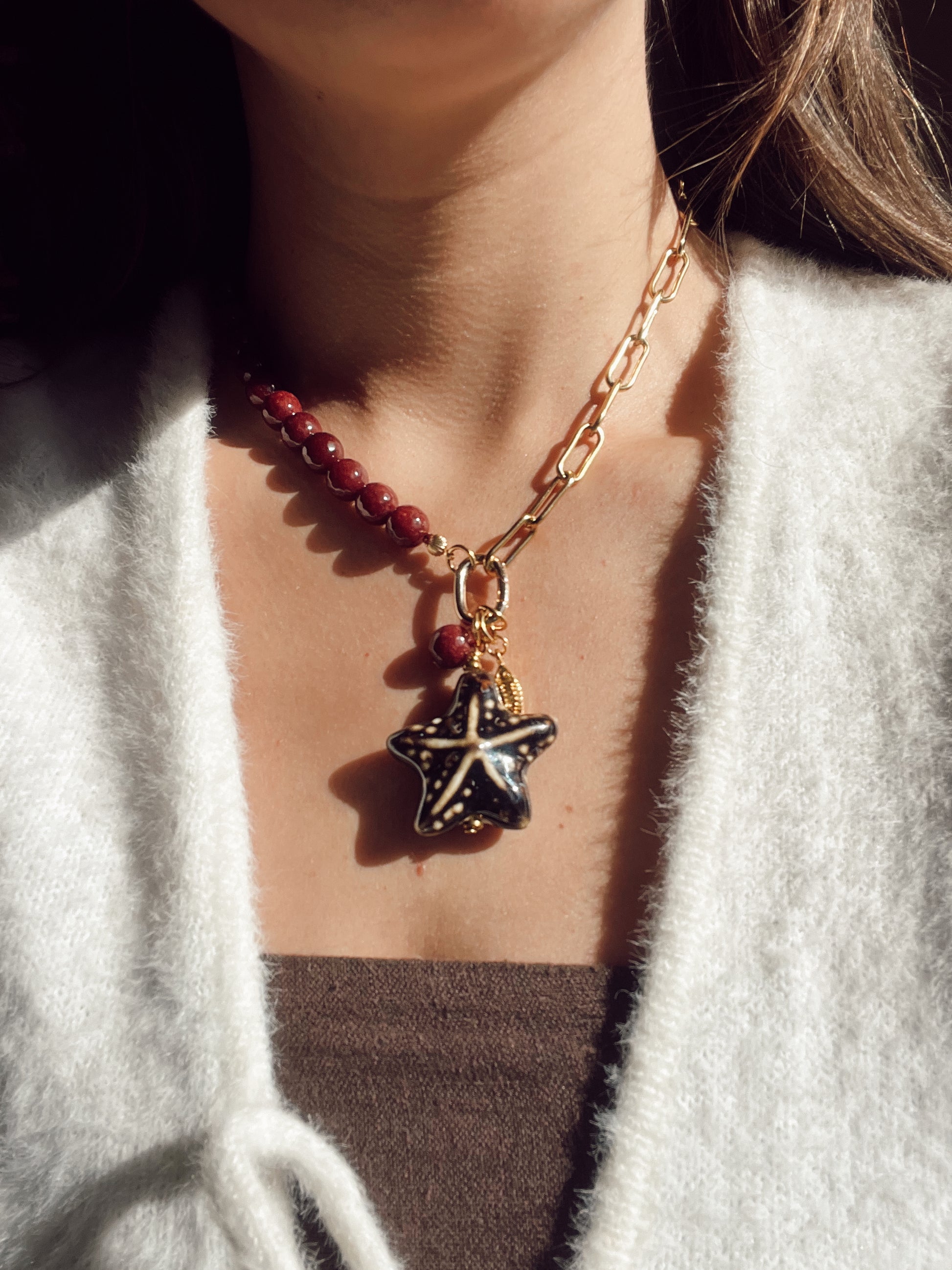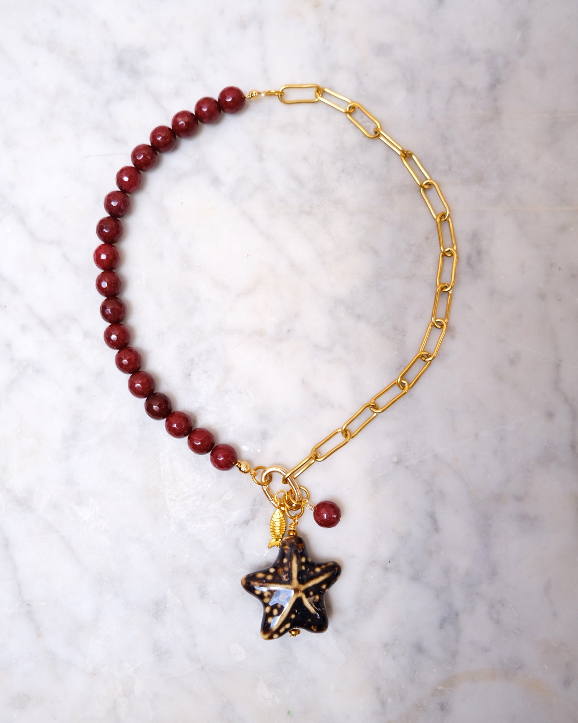 Collar de agatas facetadas color burdeo, cadena de acero inoxidable y colgante de cerámica.